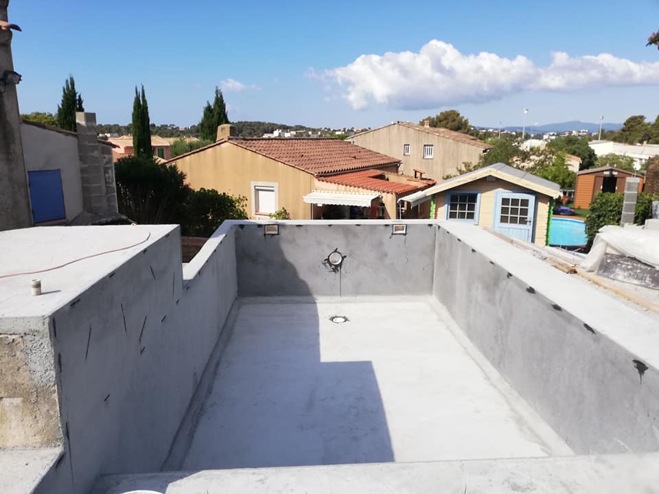 Création d’une piscine enterrée de 6m x 3m pour une maison à Saint-Raphaël (Var), à partir d’un bassin existant plus petit qui a été agrandi et renforcé.