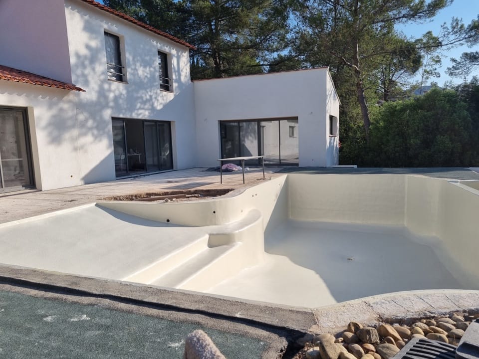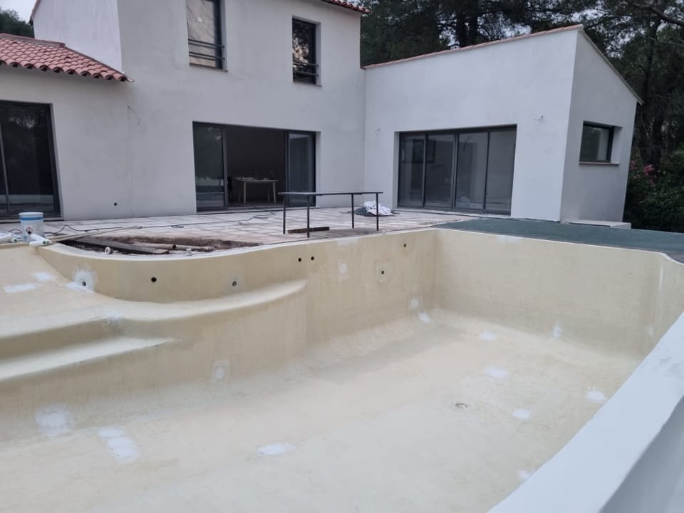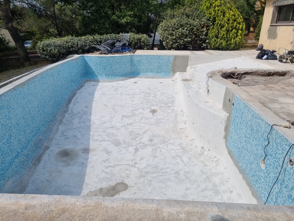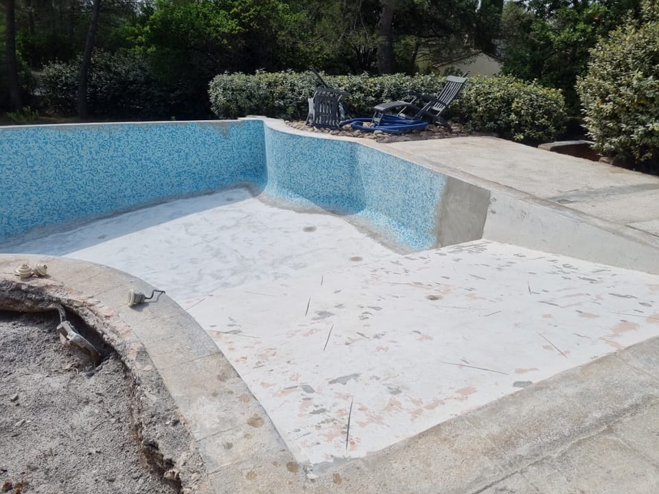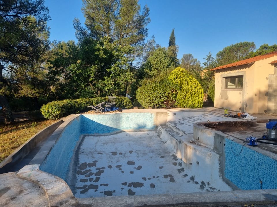 Dans le cadre de la rénovation complète d’une villa à la Bouverie (commune de Roquebrune-sur-Argens, Var), nous sommes intervenus pour la rénovation de la piscine. Un bassin de 12m x 6m, avec plage et débordement, qui était auparavant recouvert de mosaïque.