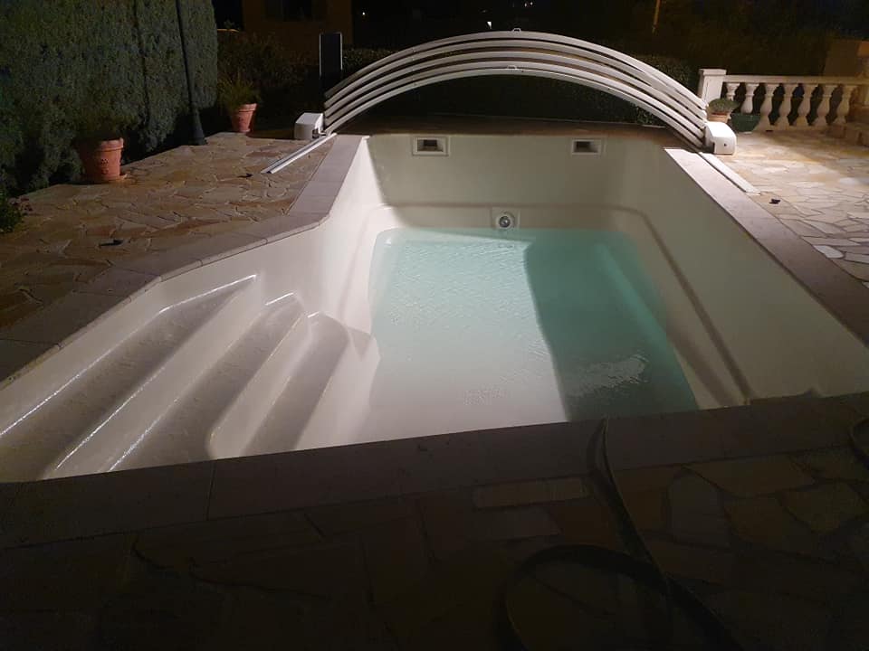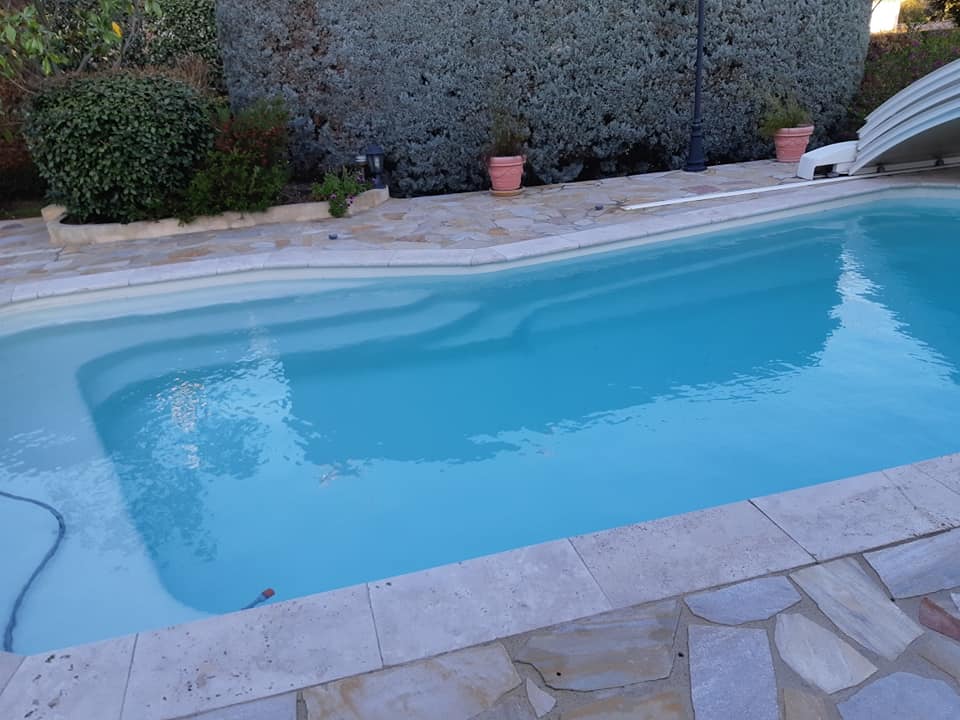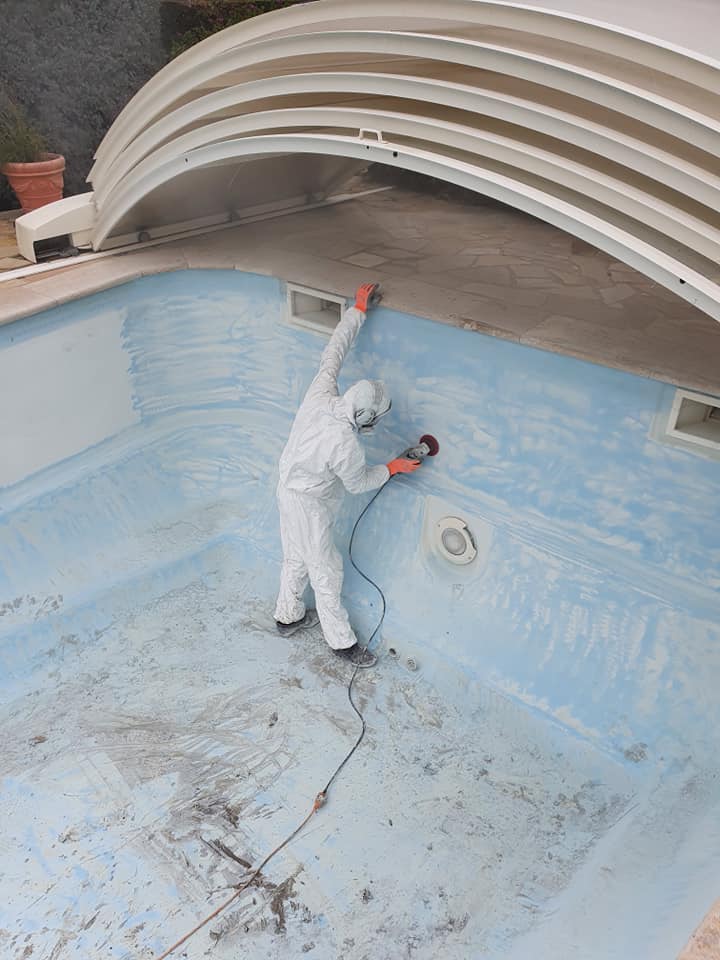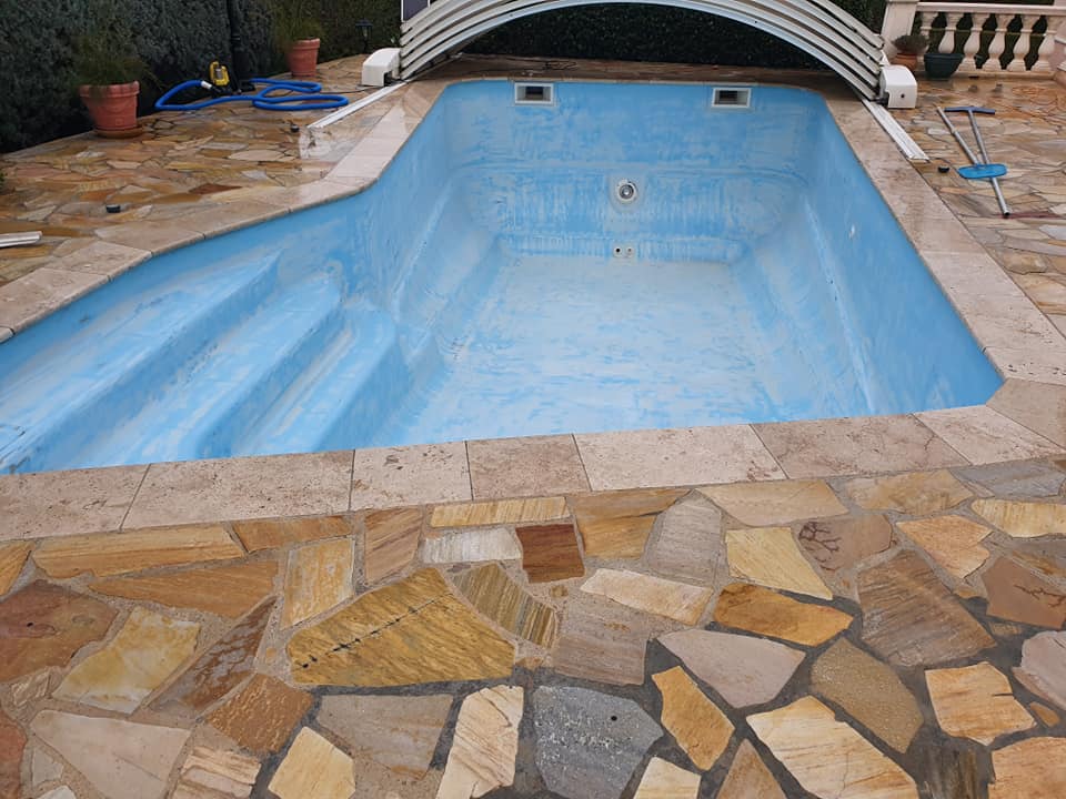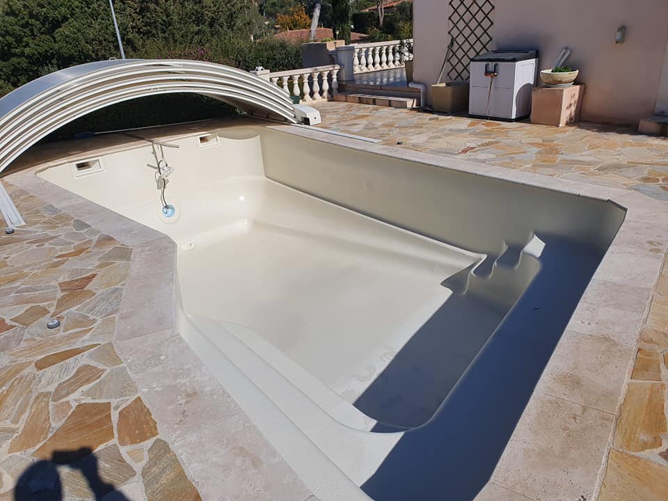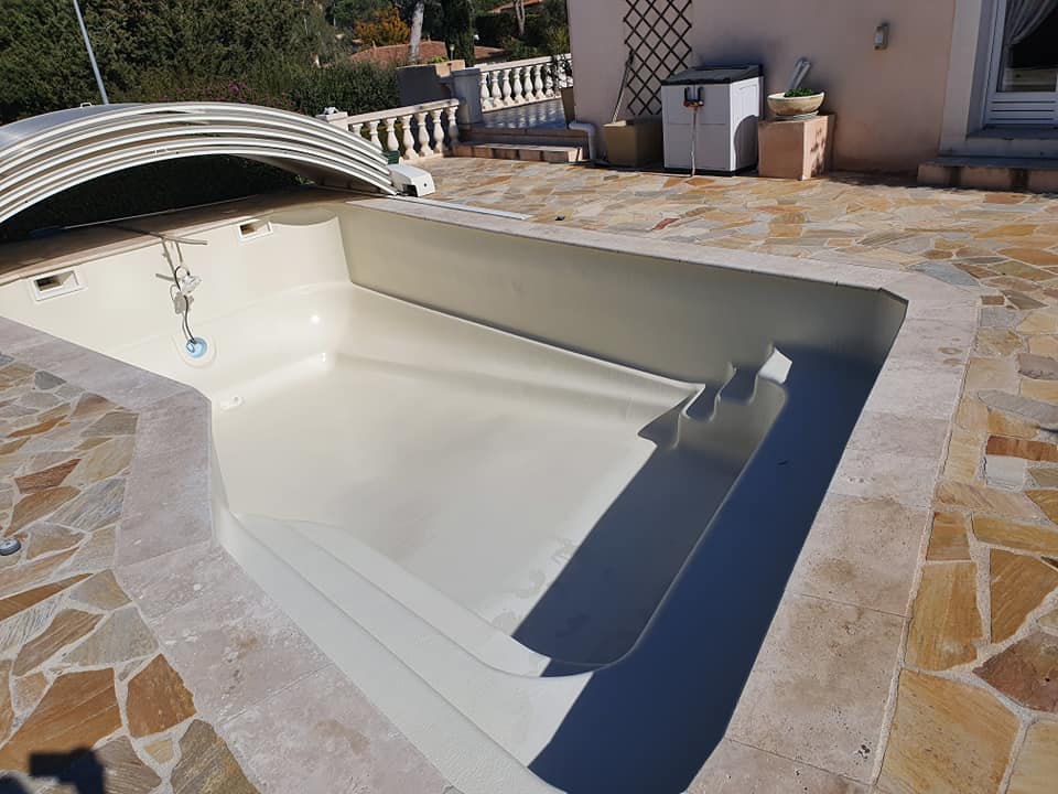 Ponçage, rincage, primaire de résine puis gel-coat et top-coat pour remettre à neuf le bassin de cette piscine à Fréjus.